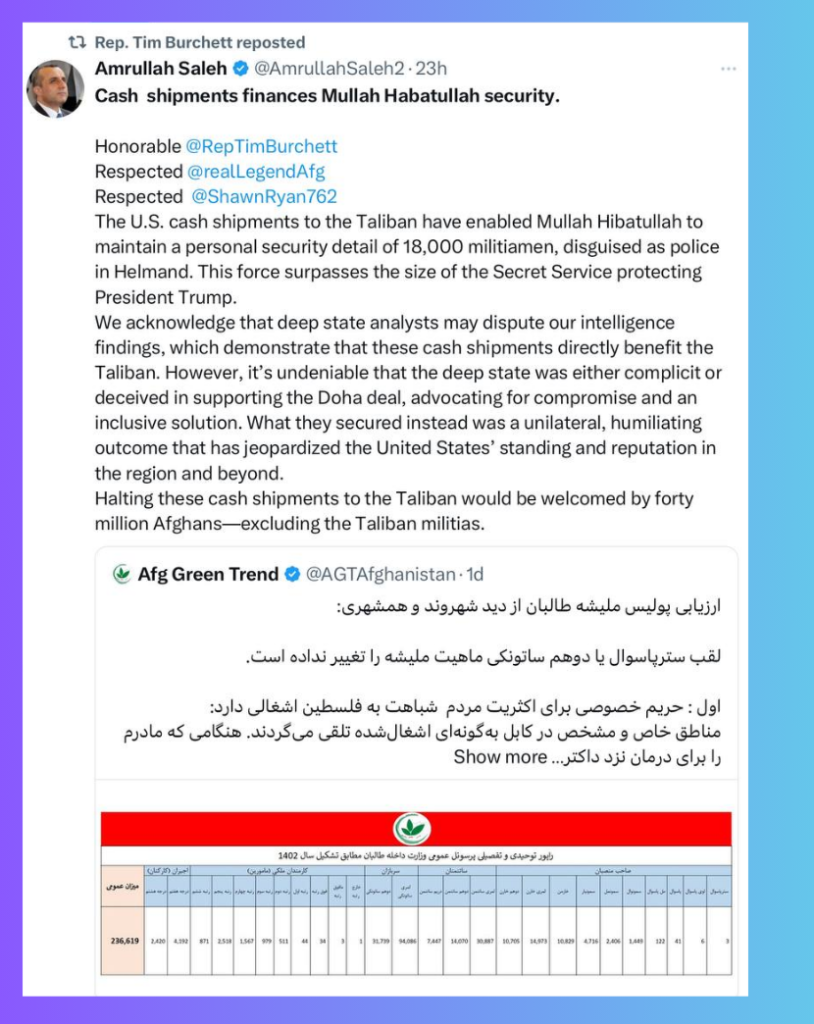 Thank you, Tim Burchett* and Mike Rulli** , for standing firm against the ongoing cash shipments that finance Mullah Hibatullah’s vast militia. Your voices help shed light on how these funds strengthen the Taliban.